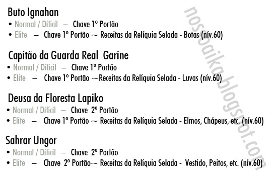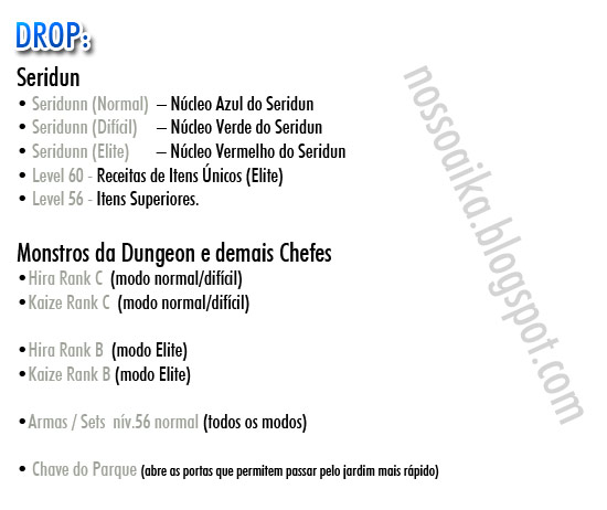Dos Drops, por enquanto foram sets/armas do lv72 normais. Itens de manufaturação, como couros, tecidos, vaizan, etc. Itens de quest não estão sendo contatos aqui.
